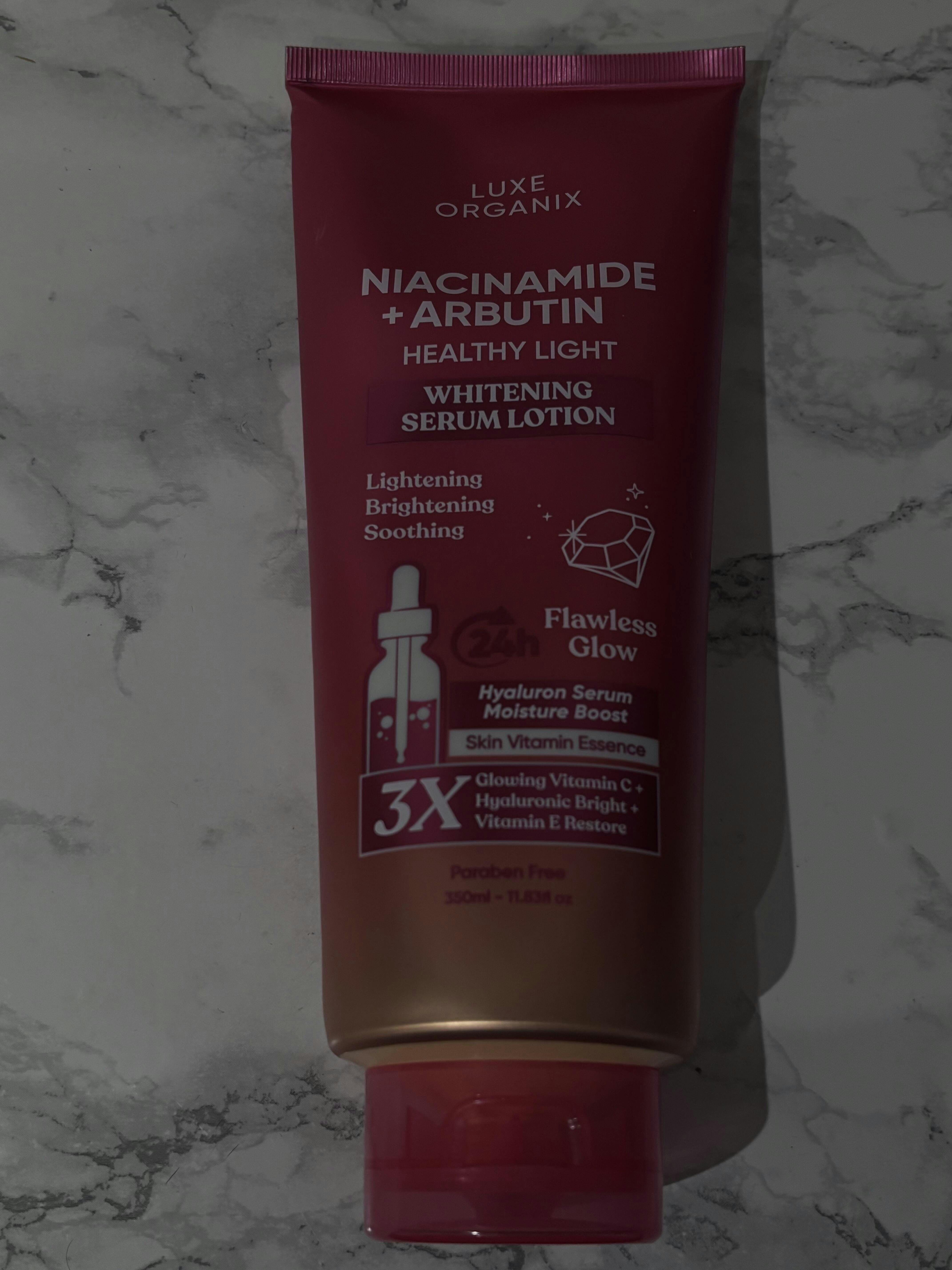 Luxe Organix Niacinamide + Arbutin Healthy Light Whitening Serum Lotion features a lightweight, non-sticky, and moisturizing formula that helps brighten the skin to restore a naturally radiant complexion. Infused with Niacinamide and Alpha Arbutin to help lighten and improve the appearance of skin for a smooth and flawless glow. With added benefits from Vitamin C, Hyaluronic Acid, and Vitamin E to revitalize dull-looking skin while strengthening the skin barrier. Indulge your skin with this concentrated serum-lotion hybrid that helps provide long lasting moisture by penetrating deeply into the skin, leaving you with brighter, softer and smoother skin.